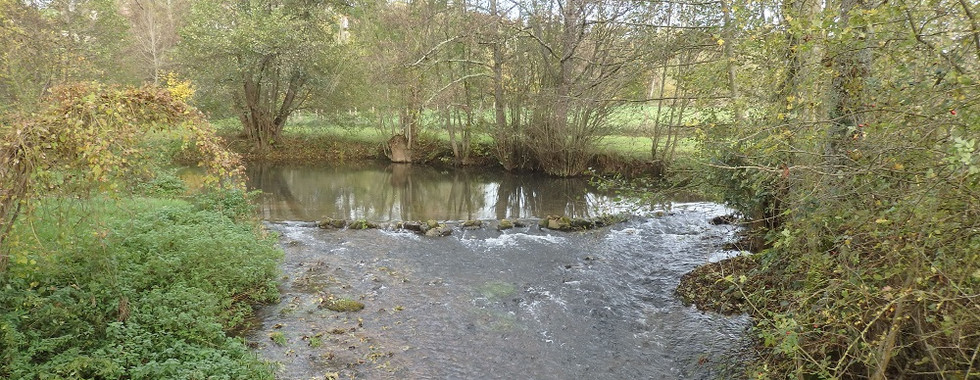 Suite à travers champs avec tas de bois, espace vert et chemin boueux jusqu’à la fausse Rivière non loin du Moulin de Vau.