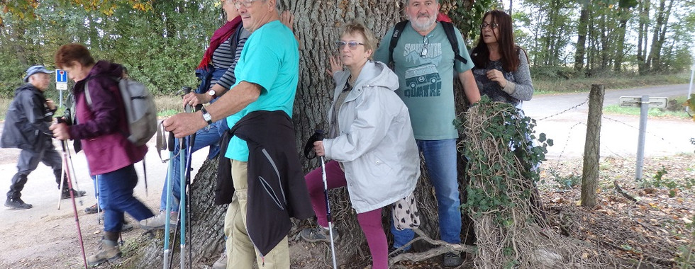 Pendant que le groupe du 10 km rejoint la Chaise et le menhir, l’autre groupe marque le pas aux Pitons pour mesurer le tronc de l’énorme chêne. Chaîne humaine plus ficelle, égale un diamètre d’environ 2 m.